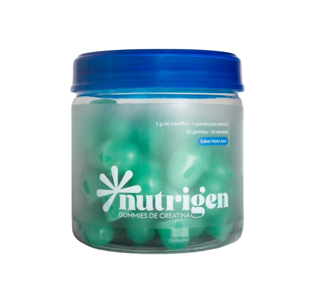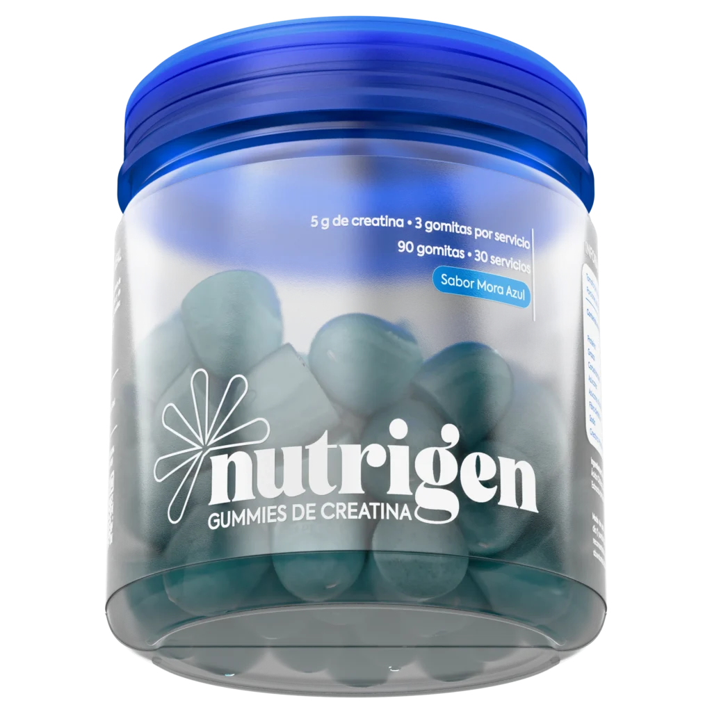 Dile adiós a los polvos complicados. Cada porción de Nutrigen ofrece 5g de creatina monohidratada pura, en gomitas de sabor mora azul, formuladas para ayudarte .